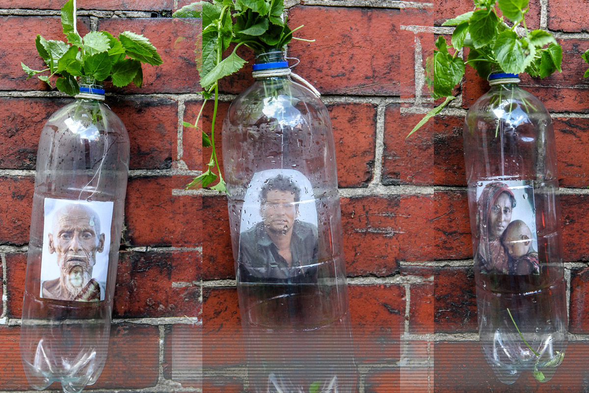 An artwork which augments the Climate Refugees photographs by Shahidul Alam using additional photography and video, creating transitional imagery bringing the photographs into a semi-urban grittiness colliding with raw objects and elements associated with environmental deterioration such as bottles, tarmac and soil. Created collaboratively between theatre practitioner Apu and emerging photographer Murad who are UK-based Bangladeshis, the artists posture that Bangladesh must continue to be resilient to survive.